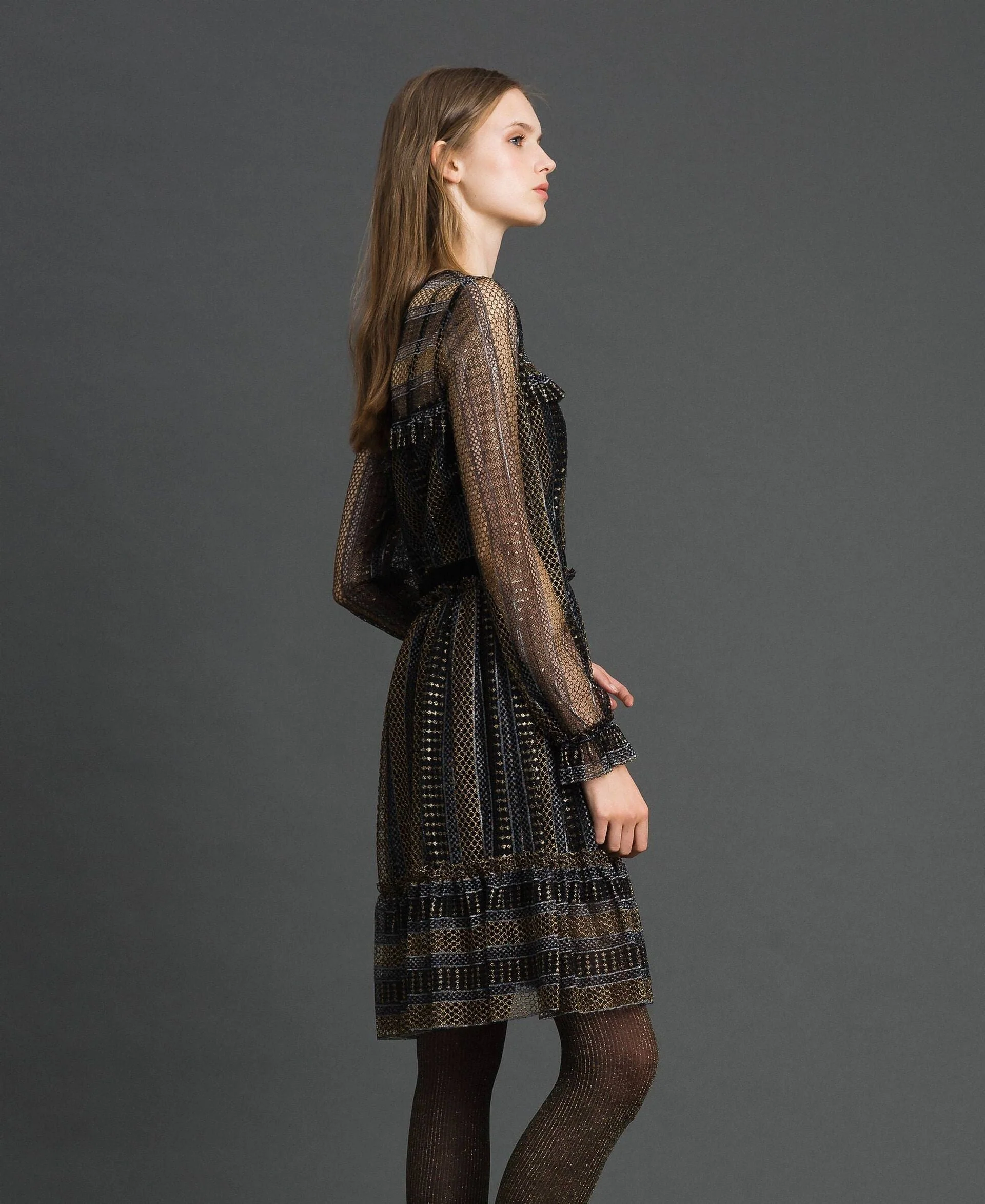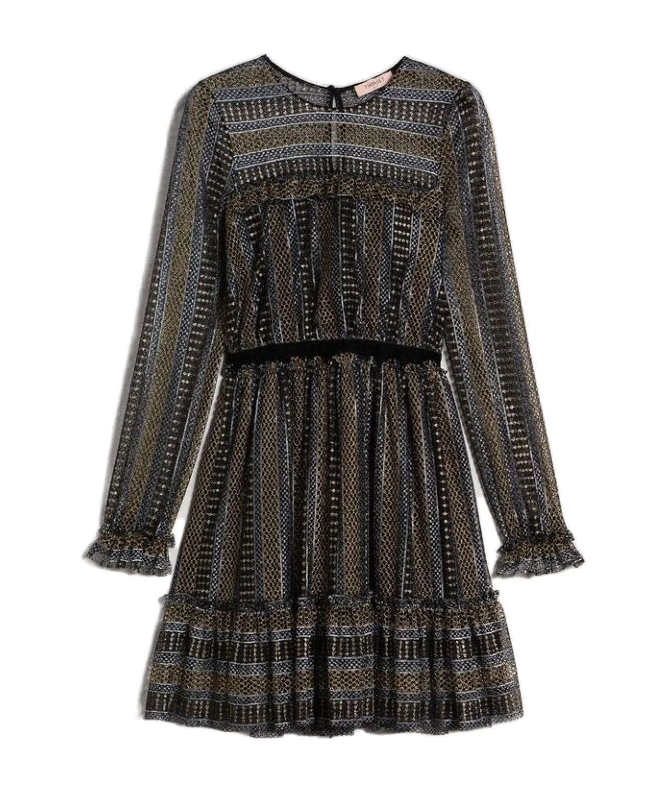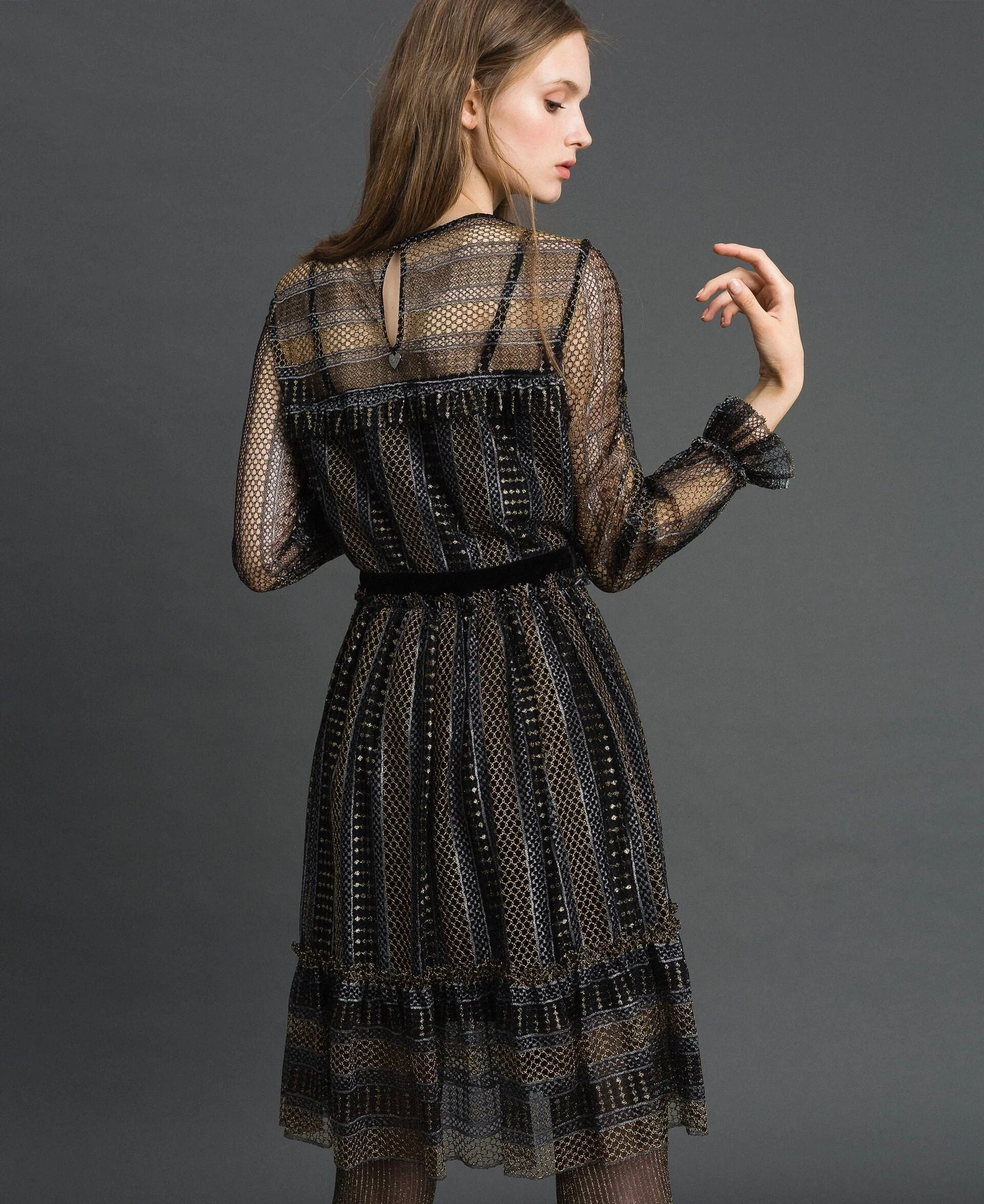 Abito corto di Twinset in pizzo lurex con dettaglio di velluto nero in vita, modello 192TT2363.
