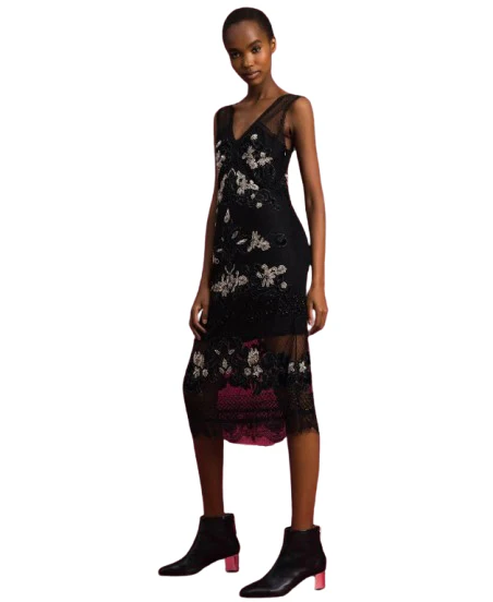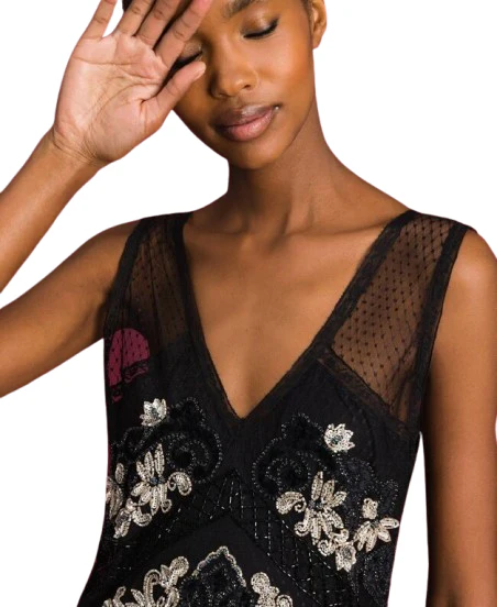 Abito di Twinset in toulle plumetis con ricami gioiello floreali con velluto, modello 192TT2042 nero.