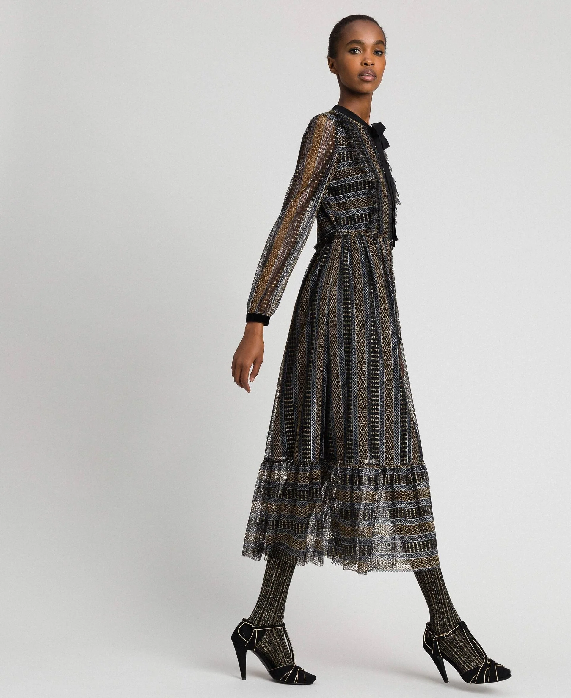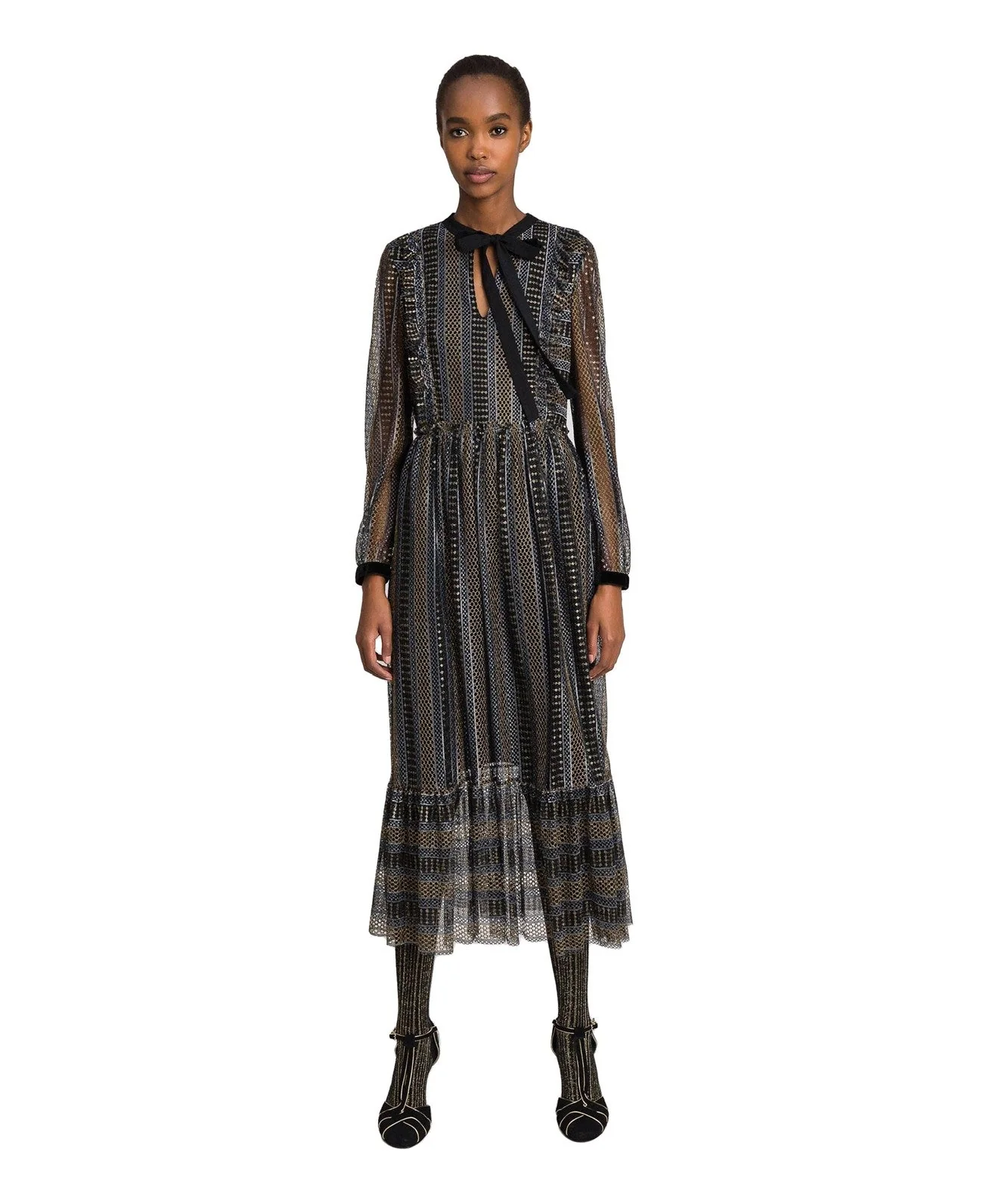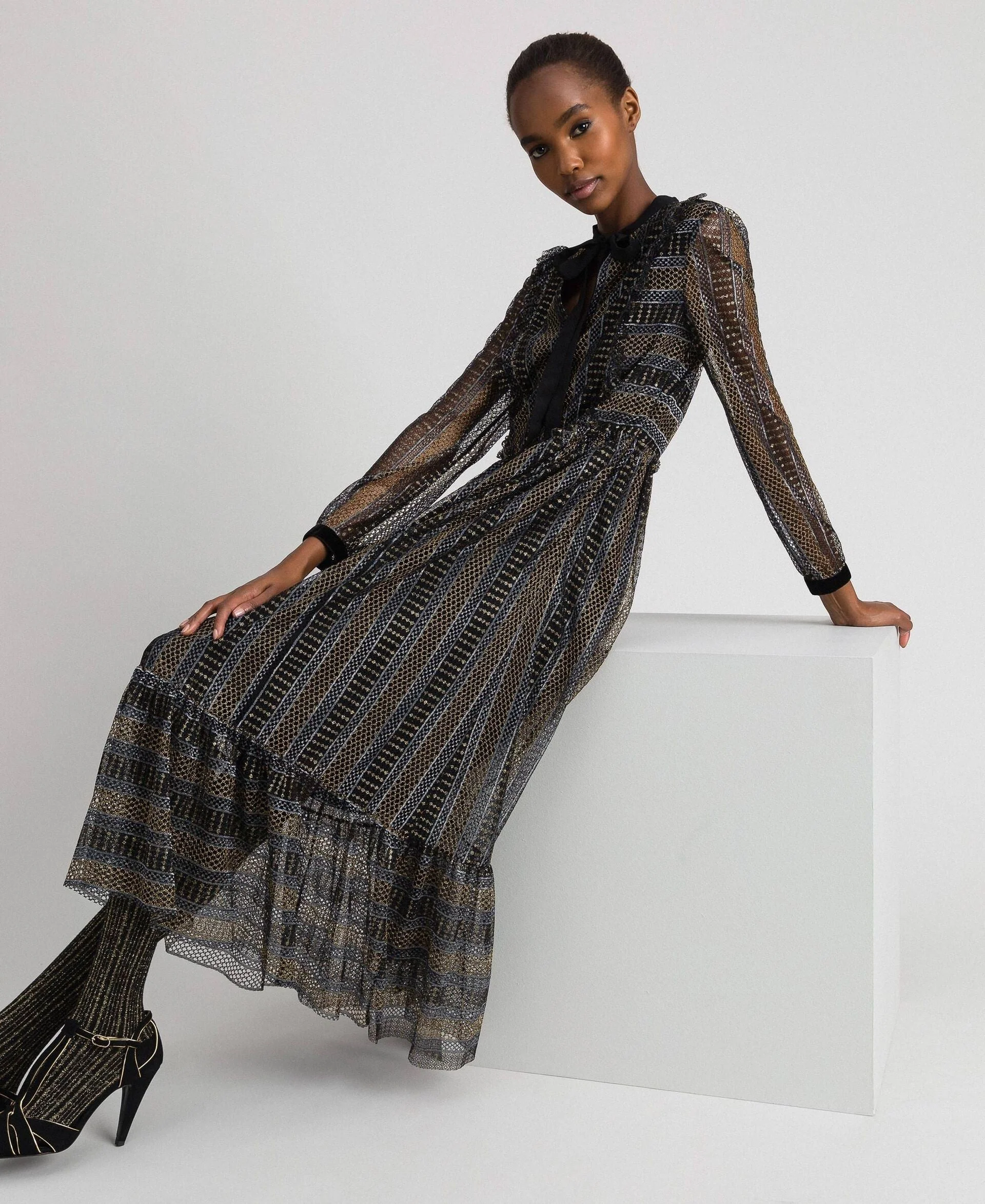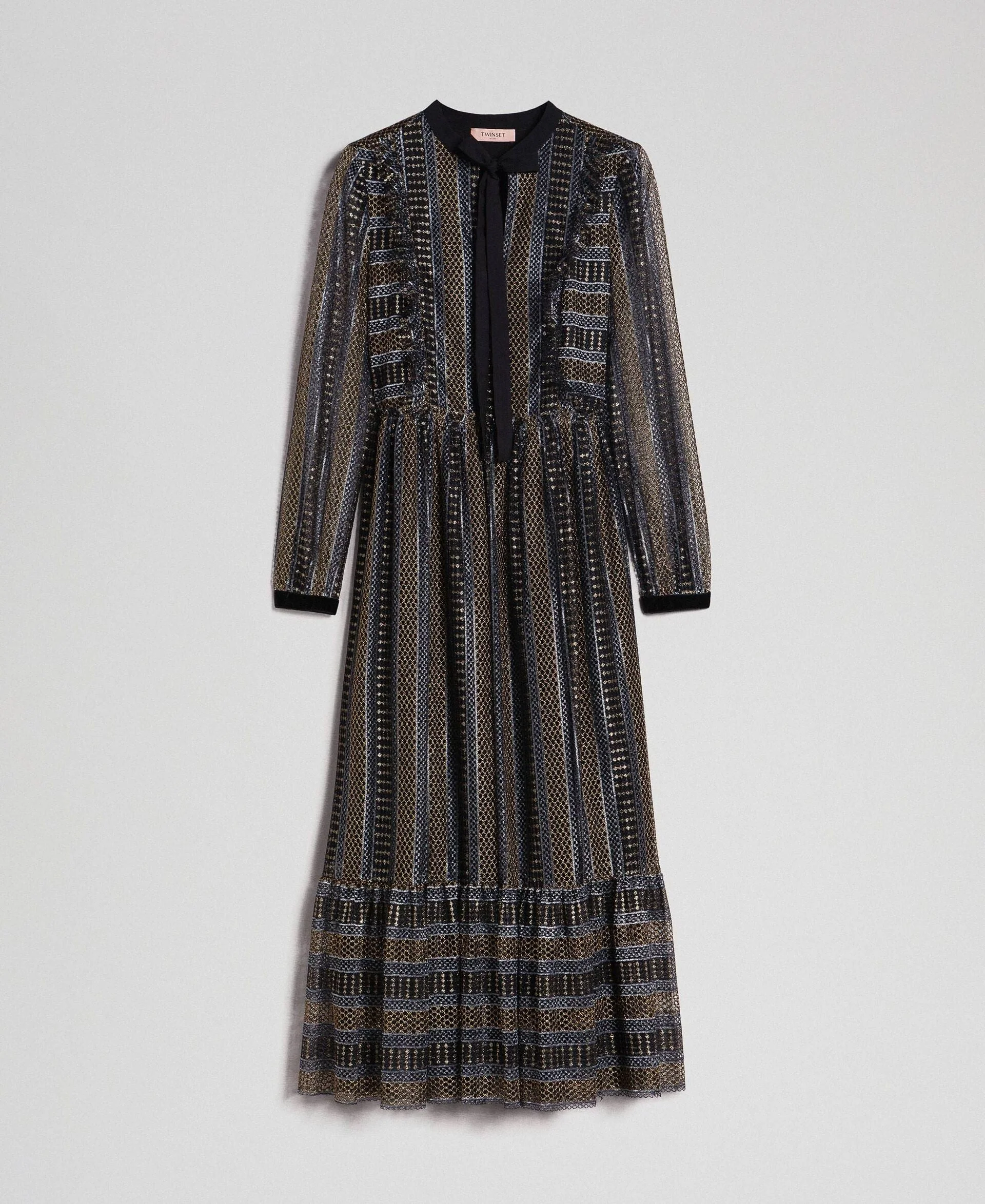 Abito lungo di Twinset in pizzo lurex con volant a taglio vivo, modello 192TT2360.