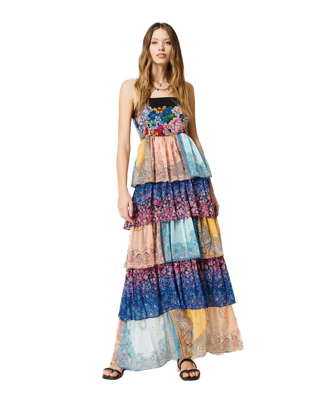 Abito lungo di Twinset a balze in maglia stampato boheamian mix. Codice: 221TP271A/06996 Abito lungo di Twinset.A balze.In creponne leggero alternato a georgette di viscosa.Spalline sottili.Disegno patch bandana multicolore.Motivo floreale su georgette di viscosa. Corpetto fitted.Zip al fianco.Foderato in georgette. Codice: 221TP271A/06996