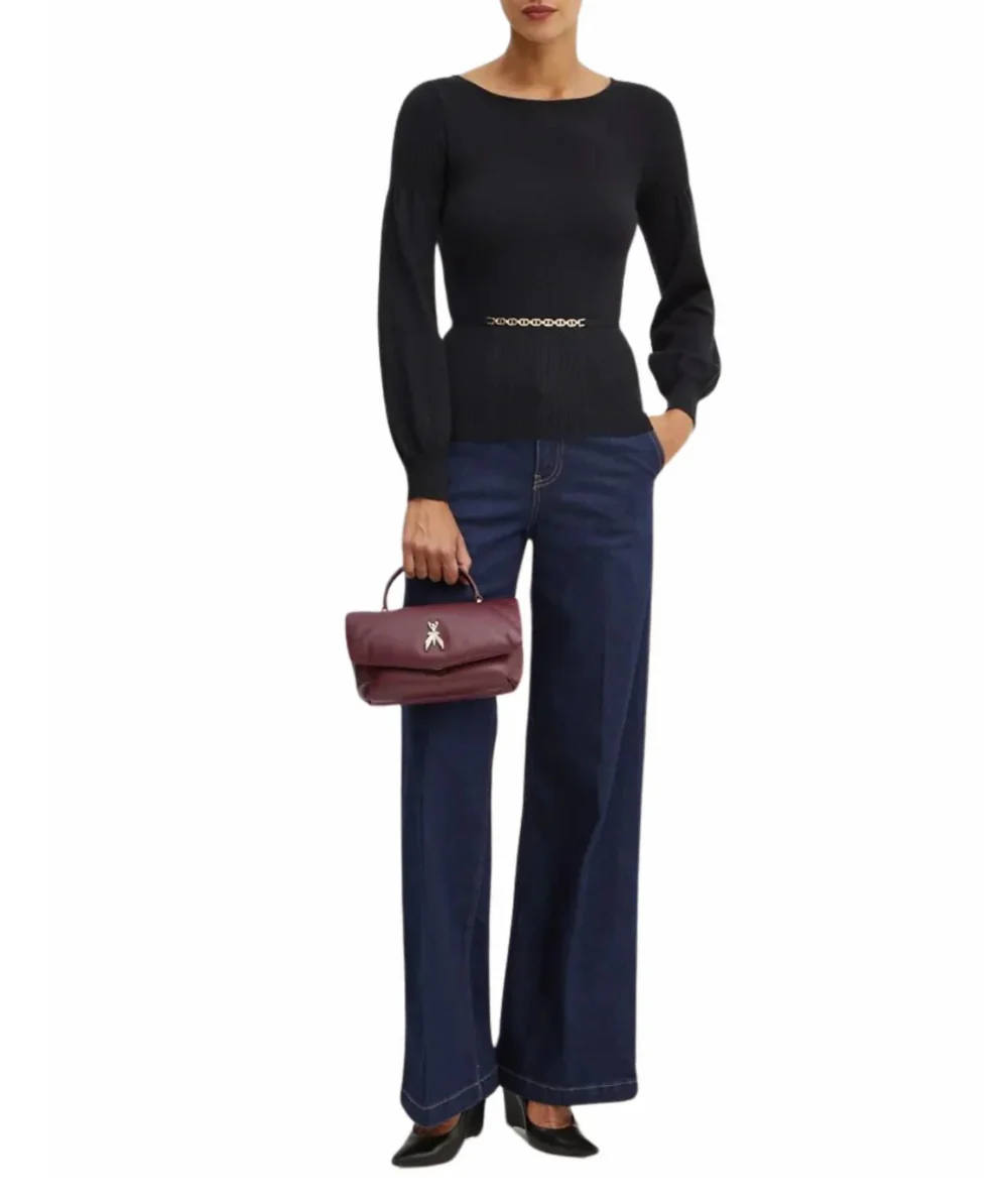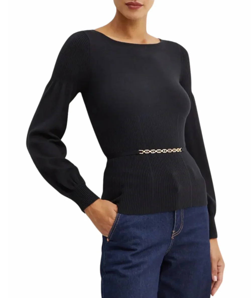 Maglia di TWINSET con cinturino logato, scollo a barca e maniche a palloncino. Codice: 242TP3590 Colore: NERO Maglia di TWINSET Cinturino removibile con logoScollo a barcaManiche lunghe a palloncino con polsiniTaglio svasatoOrlo drittoSlim fit Codice: 242TP3590 Colore: NERO
