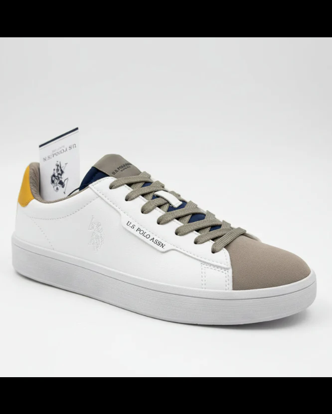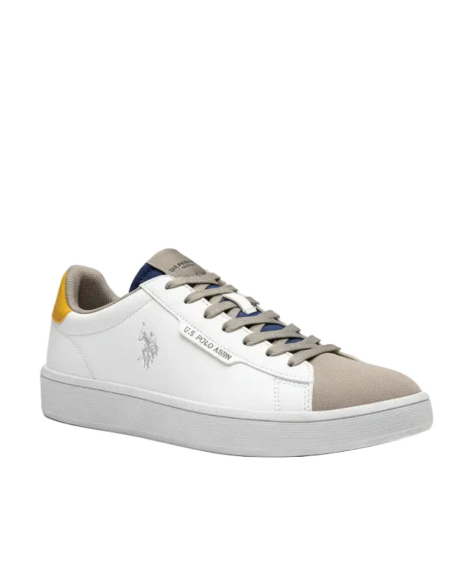Sneakers U.S. Polo Assn. da uomo, in ecopelle bianca e camoscio taupe top giallo ocra logo laterale grey per una sneakers dal comfort quotidiano. Design casual e versatile, ideale per look urbani e sportivi.